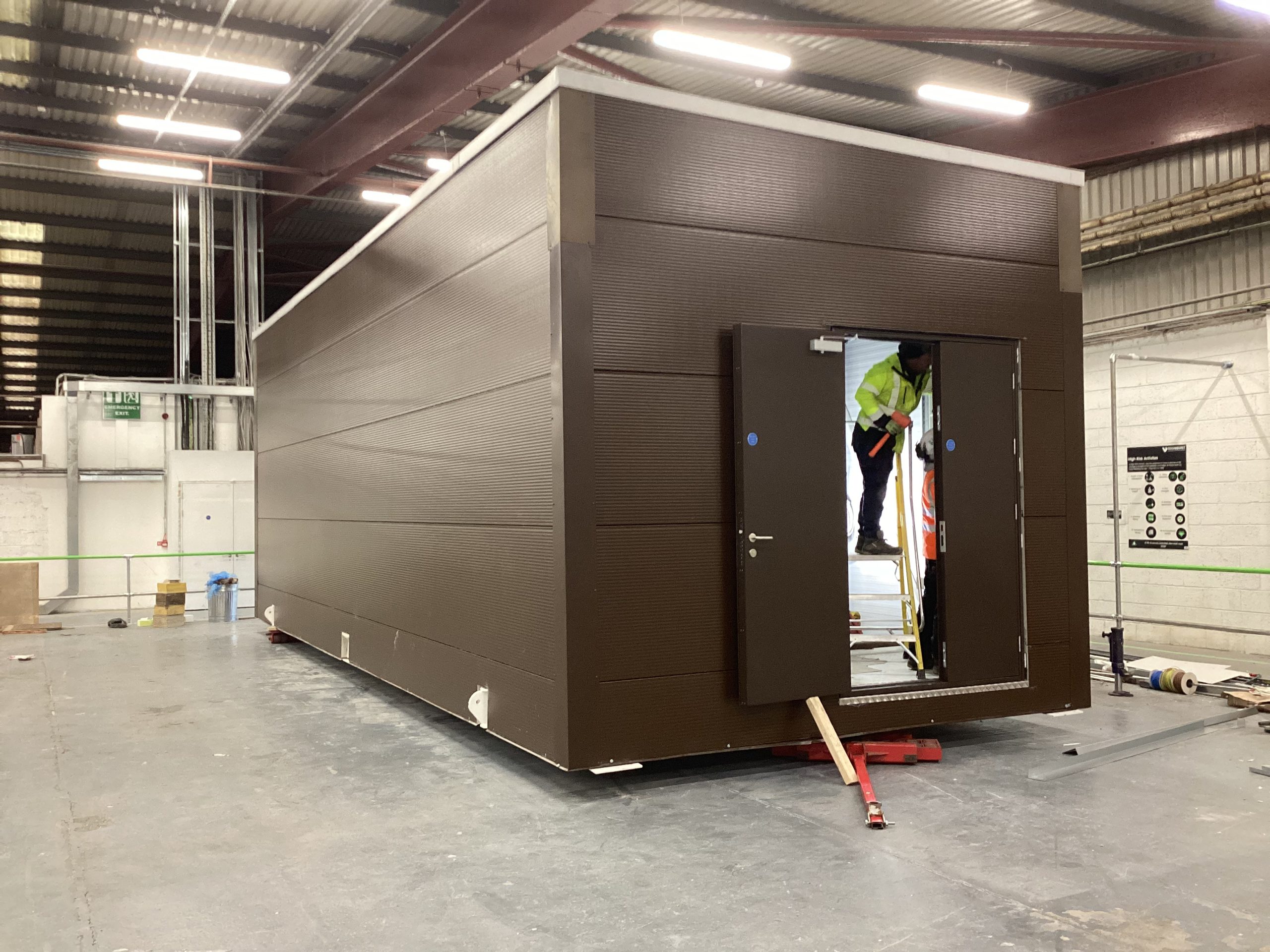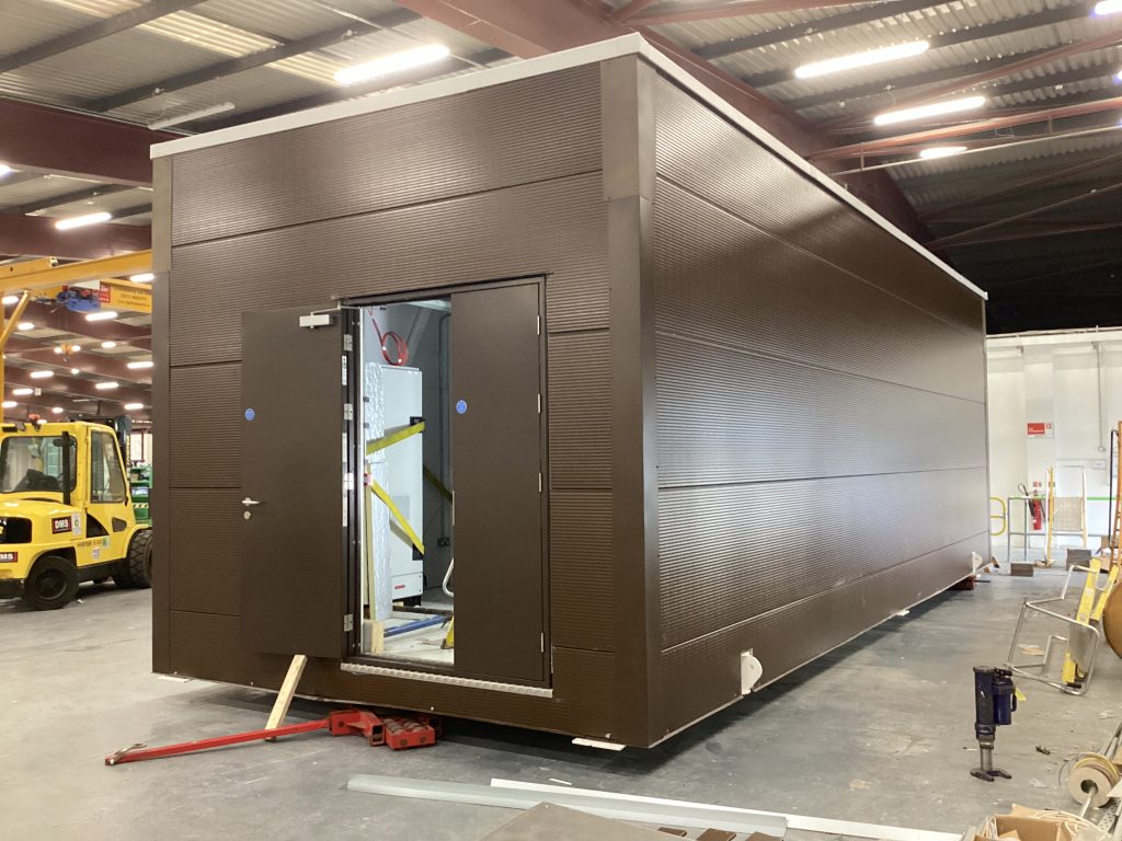A fully engineered E-House module for a critical infrastructure client, providing a fire-rated, factory-built electrical control environment designed to meet structural, performance, and safety requirements. The unit was constructed and fully fitted out offsite, including structural works, specialist switchgear, and integrated M&E systems, ensuring consistent quality and reducing programme risk. Once completed and tested in the factory, the E-House was transported to site as a ready-to-connect module, enabling rapid installation with minimal disruption. The project highlights Vision Built’s capability to deliver complex, high-specification offsite solutions that improve reliability, accelerate delivery, and support long-term operational resilience.